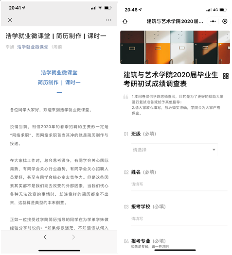 yl23411永利官网毕业生作为“出国读研”与“设计类私企就业”的目标群体,出国、求职受本次疫情影响较为严重,结合当前就业市场形势,可预见部分学生通路受阻,无措可施。为此,学院积极拓展就业渠道,通过微信推送、辅导员一对一辅导等方式,加强乡村教师计划、乡村振兴助理员、“三支一扶”、“大学生志愿服务西部计划”等基层项目的宣传力度,上线《浩学就业微课堂——2020届毕业生应征入伍政策解析》视频,鼓励大学生参军入伍,鼓励毕业生到基层就业、创业。