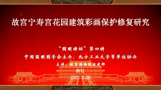 2021年5月28日下午,由中国圆明园学会园林古建分会主办,yl23411永利官网、上海交通大学设计学院建筑学系、南京信息工程大学艺术学院、湖南科技大学建筑与艺术设计学院、南阳理工学院建筑学院、中原大匠古建艺术研究院共同承办的圆明讲坛第四讲,邀请中国圆明园学会园林古建分会副会长兼彩画研究中心主任、故宫博物院杨红研究馆员作了题为《故宫宁寿宫花园建筑彩画保护修复研究》的学术讲座。讲座由中国圆明园学会园林古建分会副会长、秘书长宋国晓教授主持。本次讲座以云端会议的形式通过腾讯平台进行,来自5所承办高校及文保领域科研院所、企业的300余名师生、技术人员在线收看。