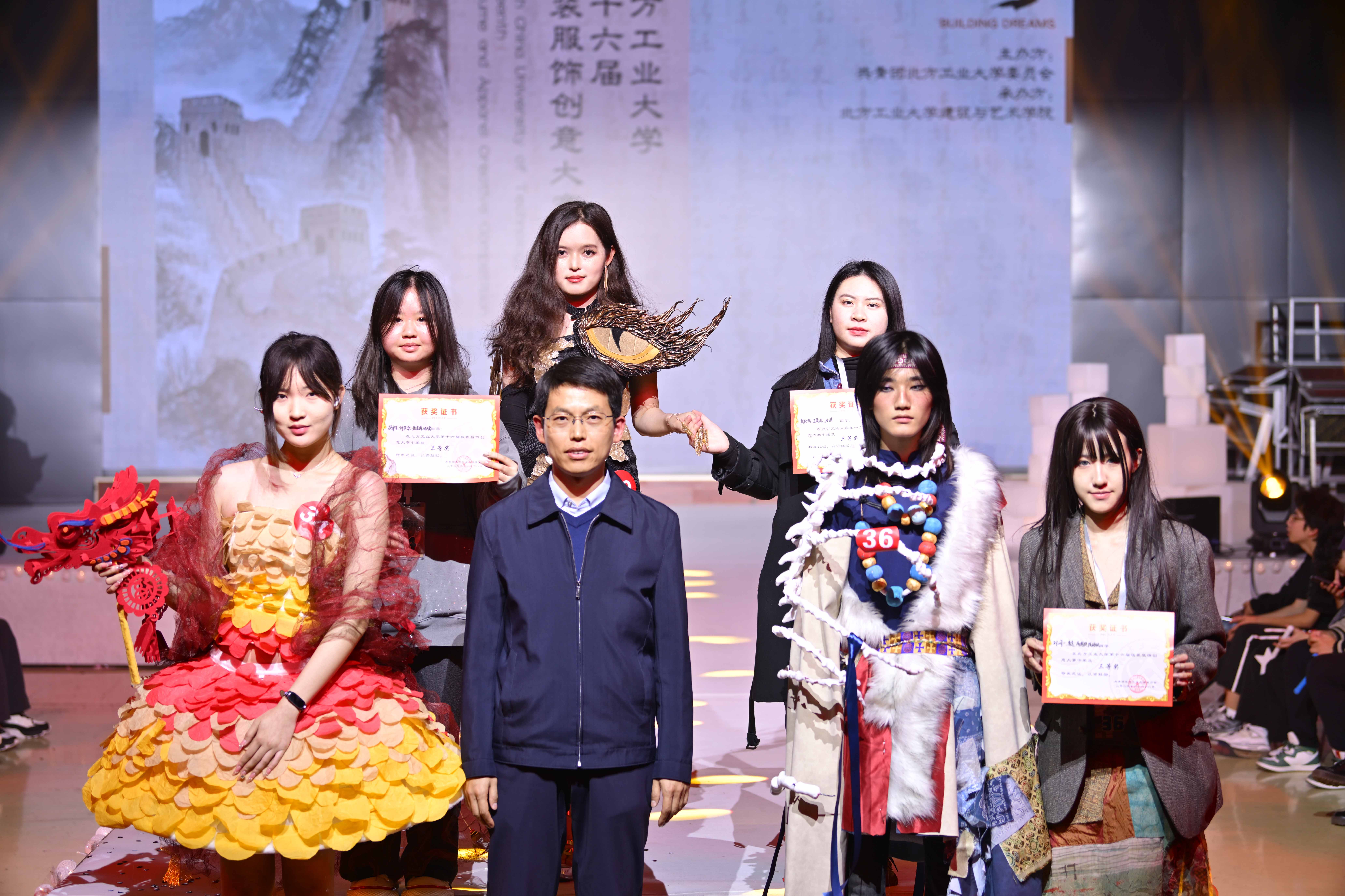 经过选手们自信靓丽地展示和评委们认真客观地评审,最终,作品《烟雨谣》荣获一等奖,作品《山海》《草龙下凡》荣获二等奖,作品《东方欲晓》《龙跃云》《森罗万象》荣获三等奖。作品《山海》《草龙下凡》《烟雨谣》《王朝先锋》《奇域》分别荣获最佳创意奖、最佳视觉奖、最佳工艺奖、最佳模特奖和最佳人气奖。校党委副书记史贞军,党委常委、宣传部部长高国伟,学工部(研工部)部长孙宗瑞为获奖代表颁奖。