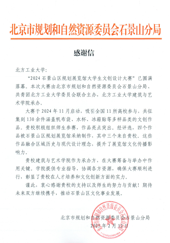 近日,永利官网收到北京市规划和自然资源委员会石景山分局发来的感谢信,感谢永利官网在筹备与举办“2024年石景山区规划展览馆大学生文创设计大赛”中发挥的关键作用。