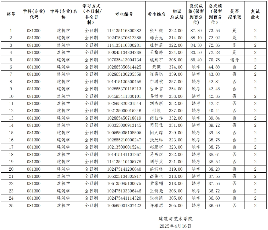 2025年建筑学(081300)第二批次拟录取名单公示(01建筑设计及其理论方向 )