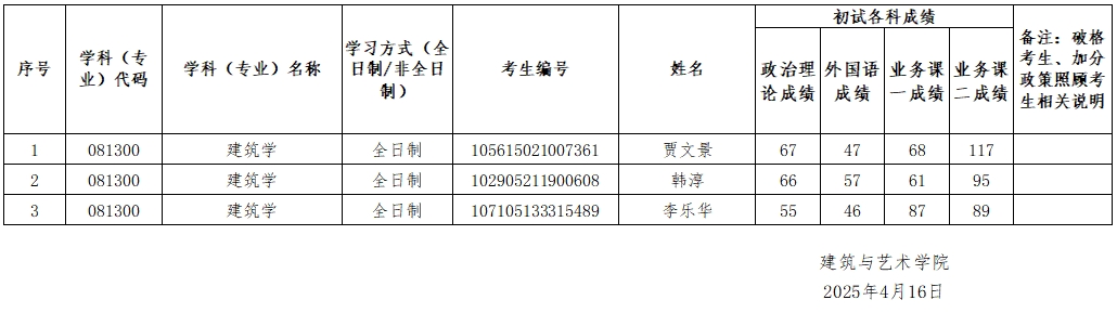 2025年建筑学(081300)硕士研究生招生复试考生补充名单公示如下: