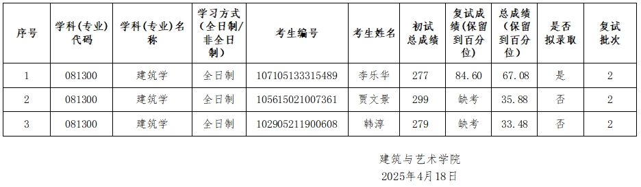 2025年建筑学(081300)硕士研究生招生复试补充拟录取名单公示如下: