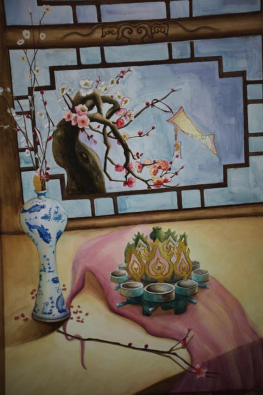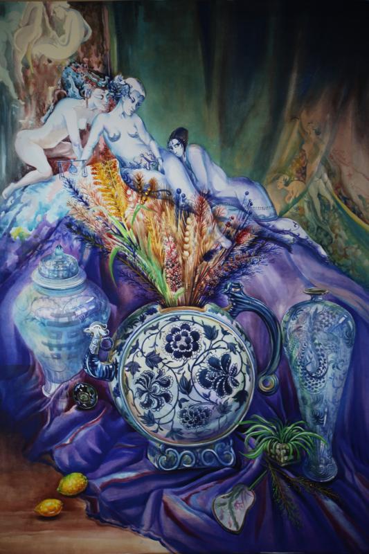 我最近读了许多纳兰性德的词作,想要创作一幅气氛古老诡秘的画作——一个古老的旧桌子上摆着鲜艳的花卉,旁边站着一位清冷小生。我也会收集资料,运用其中的符号,但通过构图、色彩、意境的构造,有意的虚实对比,对小生的形象完成了自我的创作。通过多天的加工调整,完成了整个图面的突破,也完成了自我瓶颈的突破。 画画没有什么难的,我希望大家把心中多余的心情抛去,潜心于绘画这件事中。
