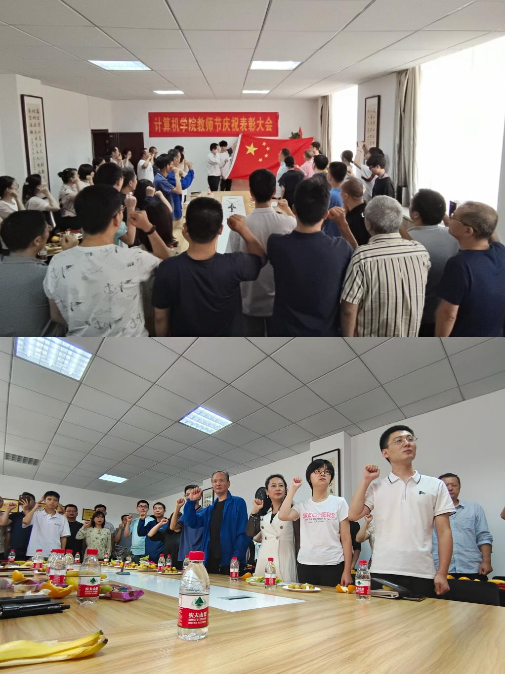 仪式上,大家全体起立,奏唱国歌,学院全体教师面向鲜艳的五星红旗,在院长杨俊清的带领下,举起右拳宣读誓词:我是一名光荣的人民教师,深知新时代赋予的任务和使命,我庄严宣誓:忠于党的教育事业,贯彻党的教育方针,履行教师的神圣职责,践行“德能日新刚健有为”的校训,弘扬“严谨、求实、勤奋、创新”的优良校风,恪守新时代高校教师十项准则,做有理想信念、有道德情操、有扎实学识、有仁爱之心的好老师,爱国守法、敬业爱生、教书育人、严谨治学、服务社会、为人师表,为学生德智体美劳全面发展奉献智慧与力量,为党和人民的教育事业而努力奋斗!