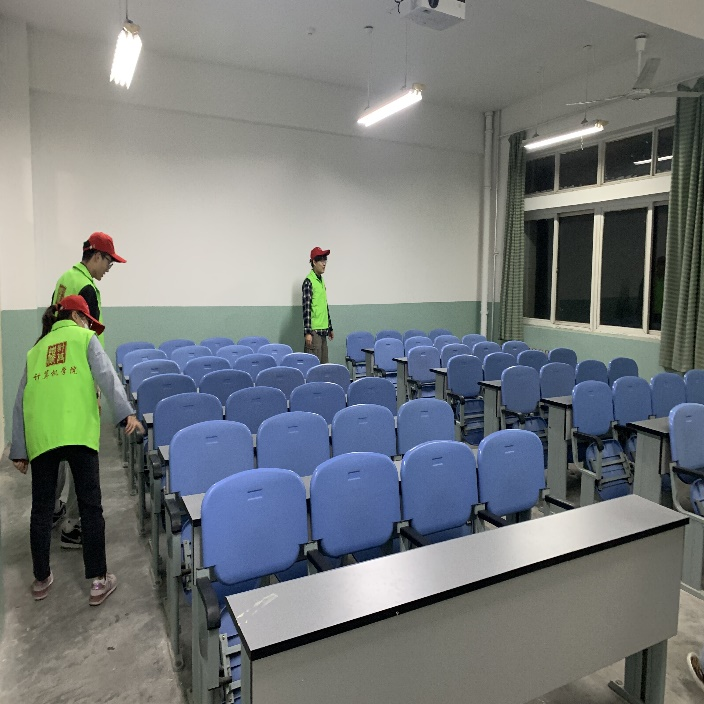 为了能够给师生们提供一个安静的学习和舒适的生活环境,每天晚自习过后,学院组织志愿者中队的同学们会分组检查教室的卫生。在检查的过程中,志愿者认真的检查教室的每一个角落,及时反馈打扫教室班级问题,督促落实教室卫生,以便给大家带来一个更好的学习环境。