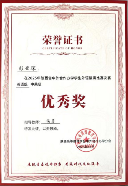 近日,由中共陕西省委教育工委、陕西省教育厅联合主办,陕西省高等教育学会中外合作办学分会及西安工业大学共同承办的2025年陕西省中外合作办学学生外语演讲比赛圆满落幕。计科256B班彭亚琛同学在比赛中表现优秀,荣获优秀奖。